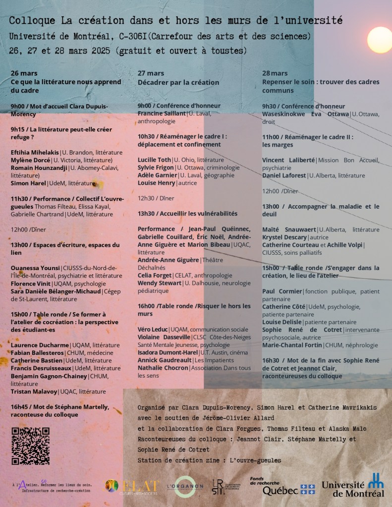 Université de Montréal (vice-rectorat à la recherche, à la découverte, à la création et à l’innovation; Département de littératures et de langues du monde; Département des littératures de langues françaises) • Fonds de recherche du Québec • À l’atelier. Re/éformer les lieux du soin. Infrastructure de recherche-création • L’Organon : Espace de recherche et de création • Laboratoire sur les récits du soi mobile (LRSM) • CELAT : Cultures, Arts, Sociétés